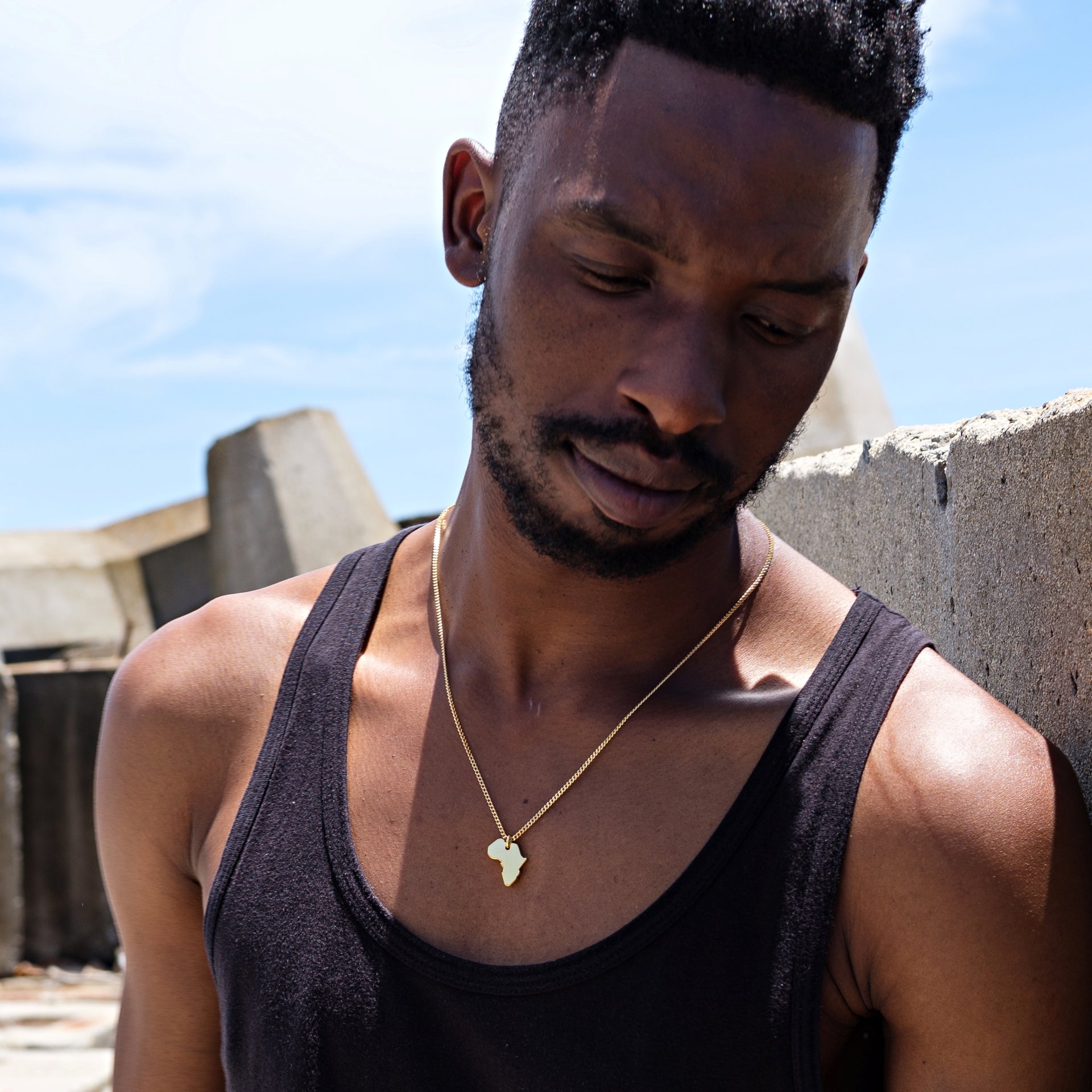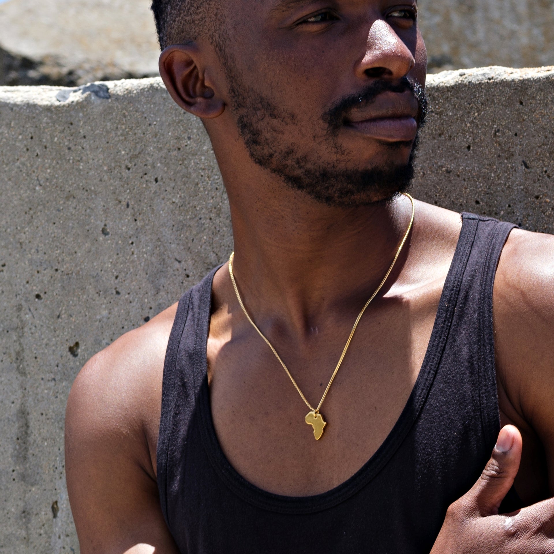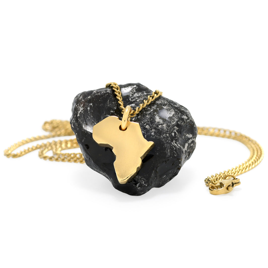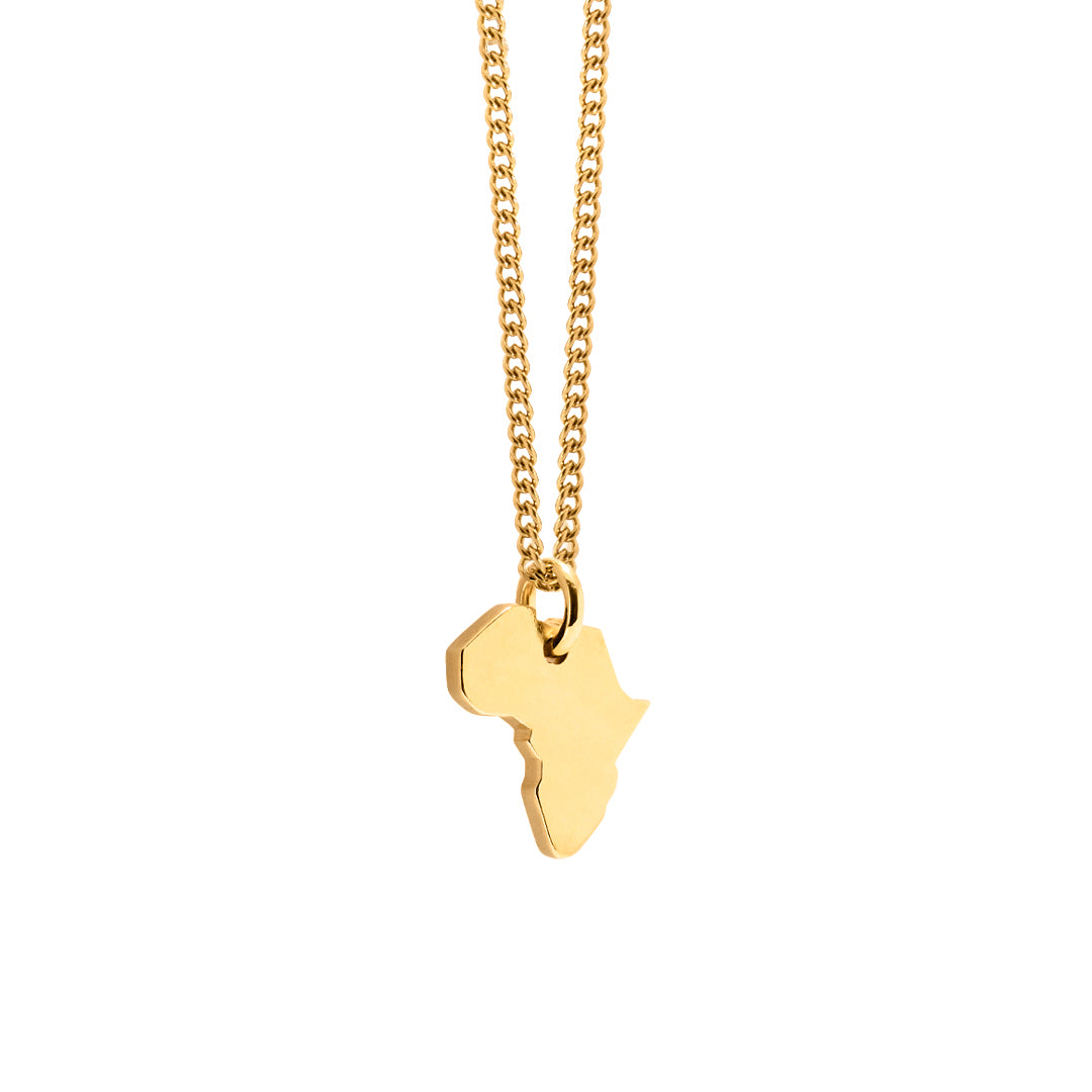 Our signature Africa necklace in a striking gold finish – compact in form, bold in meaning. A small piece that carries the strength and spirit of the continent.